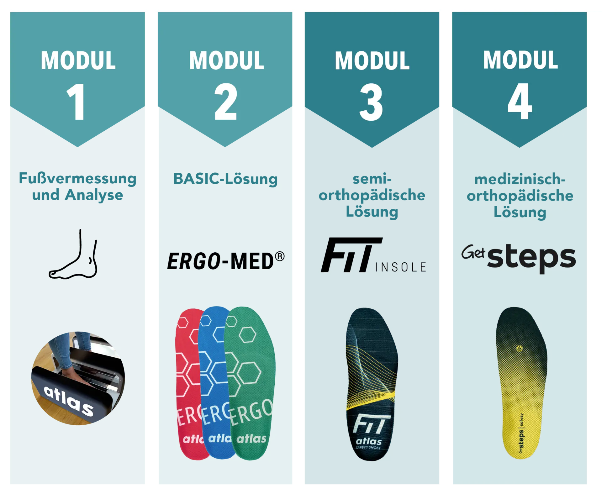 Sie haben die Möglichkeit der Auswahl aus den untenstehenden Modulen für die individuelle Einlagenversorgung. Sie können sich für ein Modul oder für eine Kombination entscheiden.